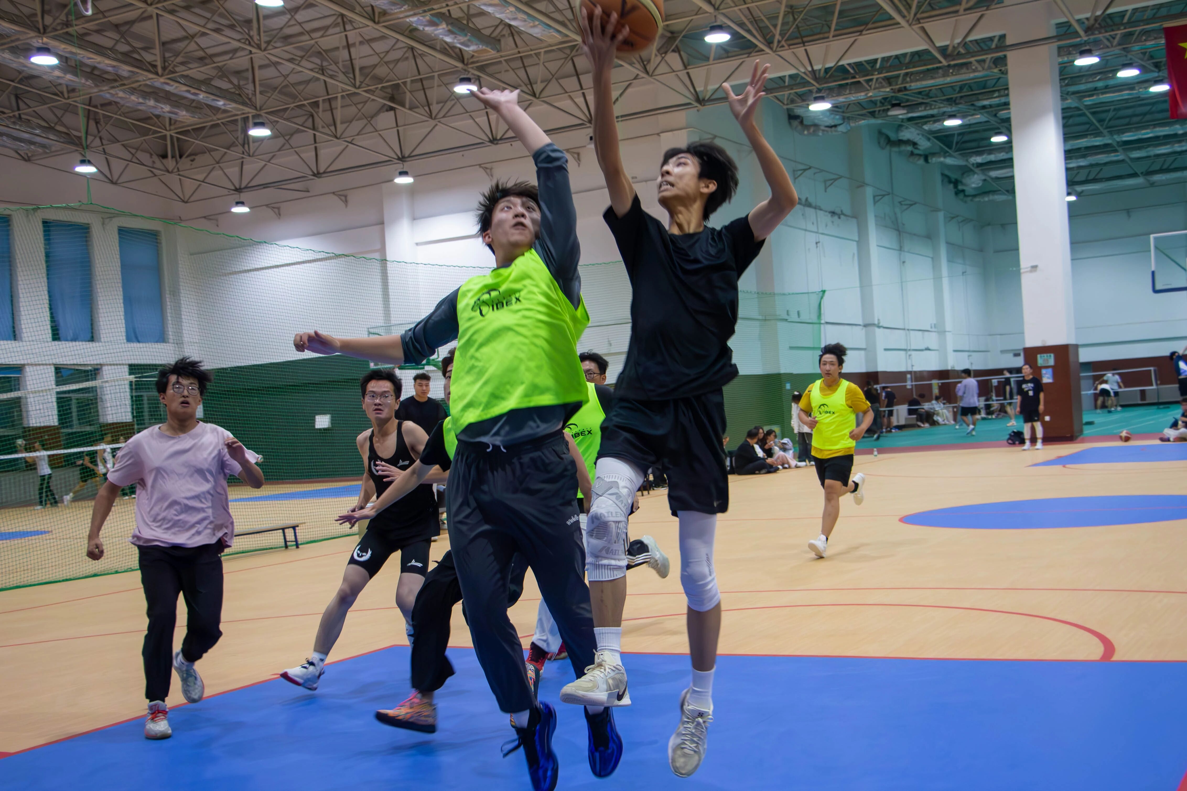 赛场上,控球、突破、抢断、投篮的身影不断交织。比分交替上升,球员们积极调整战术,默契攻守,场边欢呼呐喊声浪如潮,每一个精彩瞬间都定格着青春的热血与拼搏。