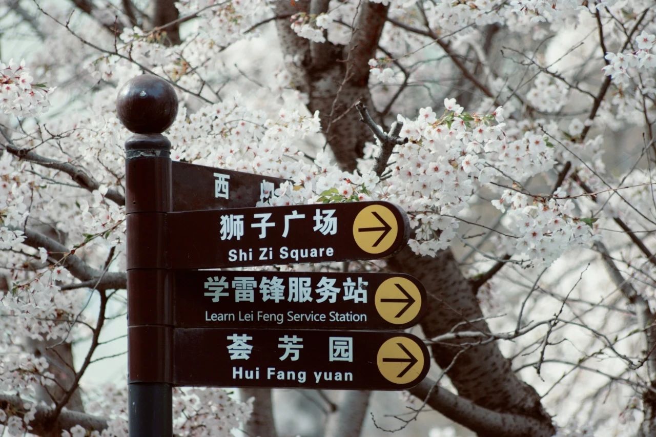 标志牌的樱花仿佛会说话,指引着人们的前进方向。