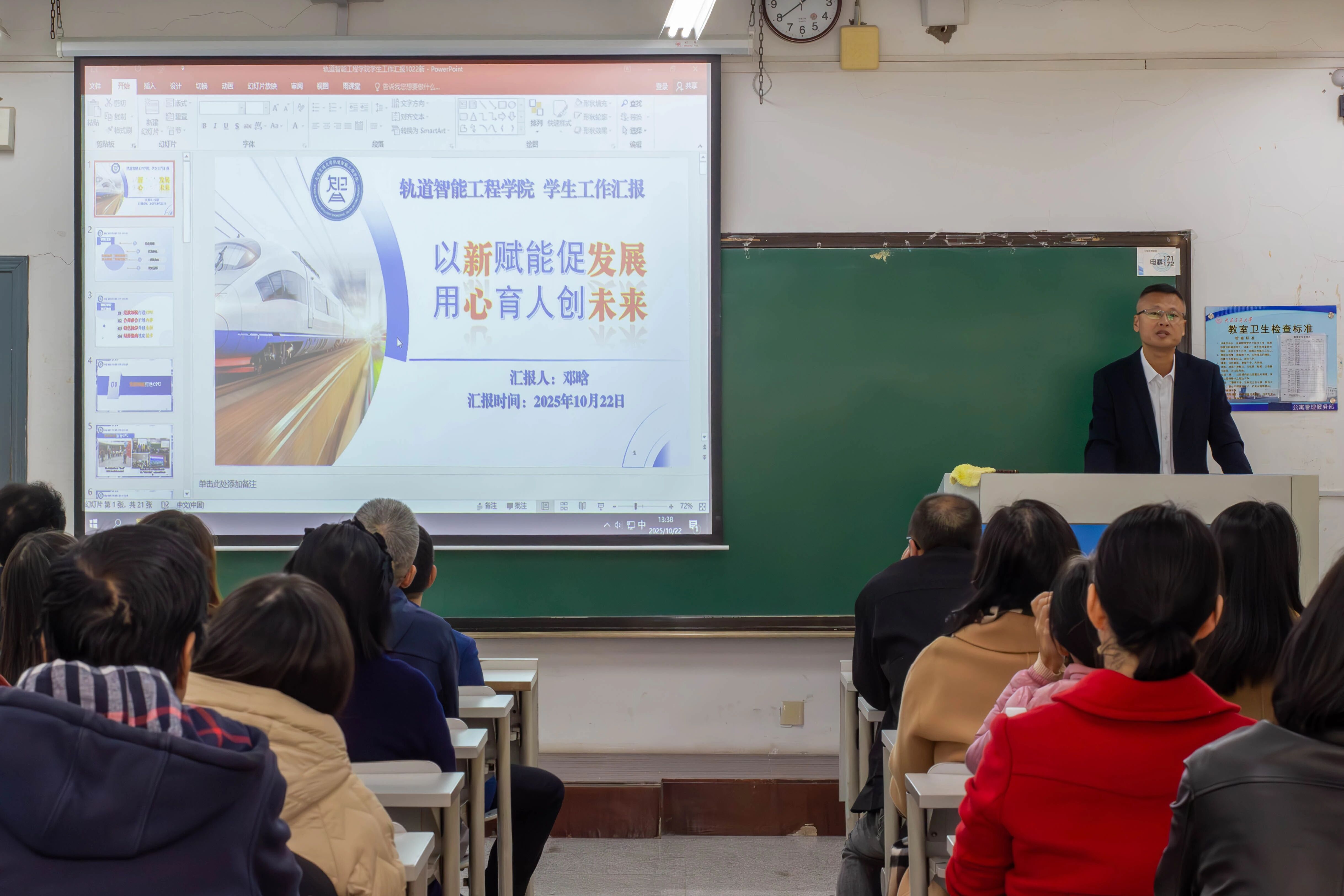 学院党委副书记邓晗从思想引领、学风建设、文化活动、就业服务等方面,全面总结了近期学生工作的开展情况,深入分析了工作中的亮点与不足,对取得突出业绩的学生工作成果进行详细介绍。他强调,学生工作是学院人才培养的重要环节,全体教职工要协同发力,共同助力学生成长成才。