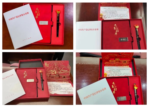 在这特别的时刻,姜来金书记亲手为毕业生党员们颁发毕业纪念品,包括学院精心设计的“廉洁”教育鼠标垫、精美钢笔纪念本套装以及《中国共产党纪律处分条例》。愿毕业生党员们带着这份温暖,在未来的道路上把忠诚书写在党和人民的事业中,把青春播撒在民族复兴的征程上。